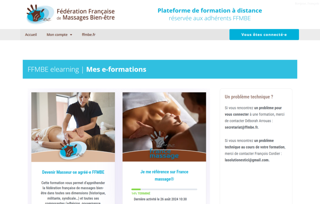 Une fois connecté.e, vous retrouvez les e-formations liées à votre adhésion dans votre Espace adhérent.